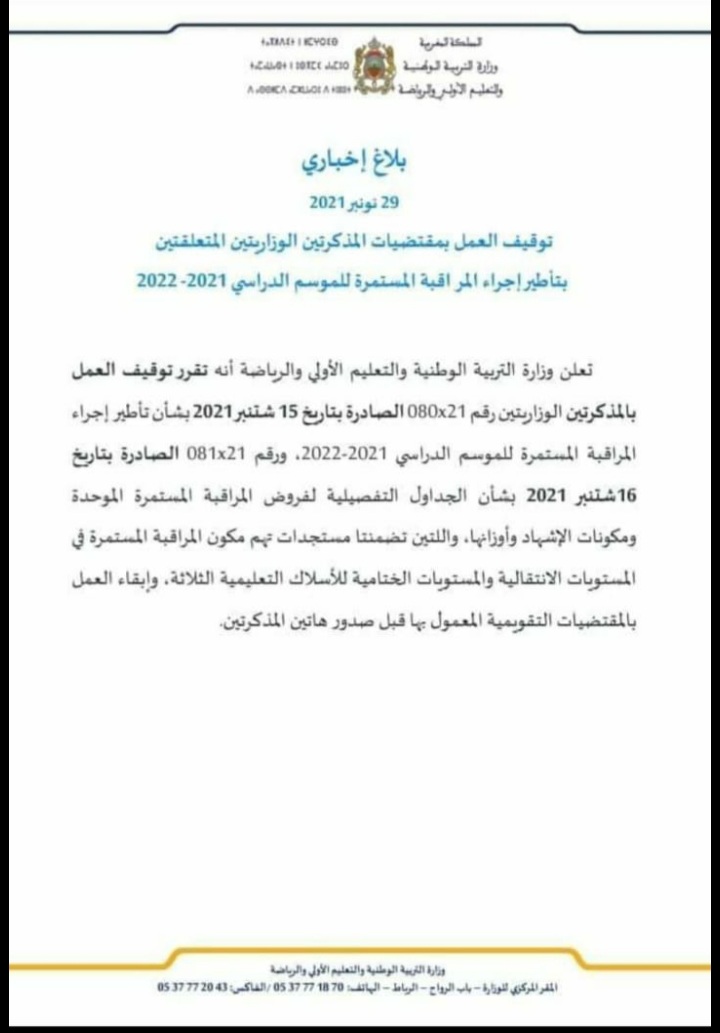لوزارة التربية الوطنية والتعليم الأولي والرياضة بتوقيف العمل للمذكرتين الوزارتين رقم 21×080 الصادرة بتاريخ 15شتنبر ،ورقم 21×081..