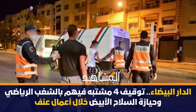 تمكنت عناصر فرقة الشرطة القضائية بمنطقة أمن سيدي البرنوصي بالدار البيضاء، خلال يومي الأربعاء والخميس 25 و26 فبراير الجاري، من توقيف أربعة أشخاص يشتبه في تورطهم في التجمهر وارتكاب أعمال عنف مرتبطة بالشغب الرياضي، وحيازة السلاح الأبيض في ظروف تشكل خطراً على سلامة الأشخاص والممتلكات.