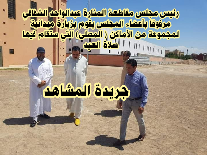 عبدالواحد الشفاقي رئيس مجلس مقاطعة المنارة مرفوقا بعدد من نواب المجلس ، يقوم بزيارات تفقدية إلى مختلف الأماكن ( المصلى ) التي ستقام فيها صلاة العيد بتراب مقاطعة المنارة ، حيث تم الوقوف على أهم الترتيبات لإستقبال المصلين في أحسن الظروف.