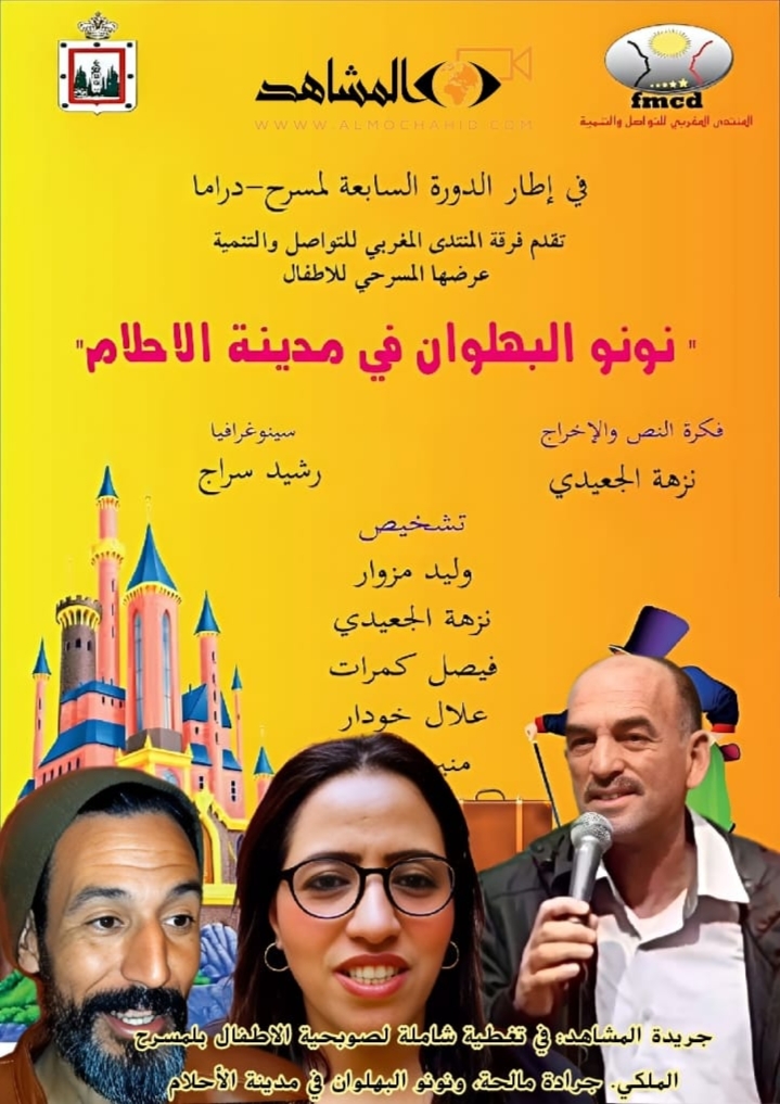 مكتب مراكش..في إطار الدورة السابعة لمسرح دراما ، وبدعم من المجلس الجماعي لمدينة مراكش ، تم يوم الأحد 21 ماي 2023 بفضاء الهواء الطلق بالمسرح الملكي ، افتتاح صباحية للأطفال بكلمة ترحيب من طرف رئيسة فرقة المنتدى المغربي : الفنانة.نزهة جعيدي ، والفنان منير العزيزي ، بعدها قدمت فرقة مسرح أيوب سمسة عرضها المسرحي بعنوان : جرادة مالحة ، بعدها تم عرض مسرحية “نونو البهلوان في مدينة الأحلام” لفرقة المنتدى المغربي للتواصل والتنمية للفنانة نزهة الجعيدي ، التي صرحت لجريدة المشاهد ، أن الهدف من مسرحية نونو البهلوان في مدينة الأحلام هو محاولة إدخال البسمة والفرحة على قلوب الأطفال ، كما عرفت هده الصباحية للأطفال حضور مديرة المسرح الملكي إلهام ابارو ، و مجموعة من الفنانين و الممثلين ، و أطر وأساتذة من المؤسسة التعلمية ، وبعض أباء وأولياء الأطفال، وقد لاقت هده الصباحيه التربوية استحسان من طرف أطفال مركزية تسلطانت ومراكش ونواحي …..