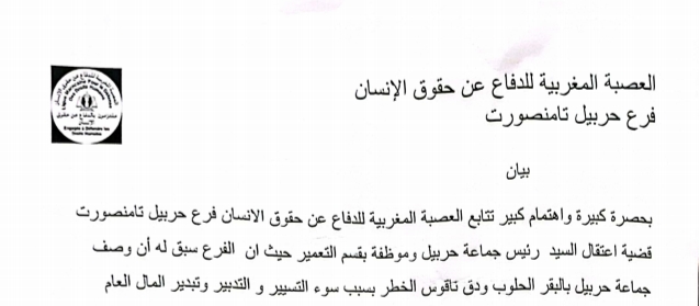العصبة المغربية للدفاع عن حقوق الانسان فرع حربيل تامنصورت تصدر بيان في ظل الأحداث التى تعرفها جماعة حربيل