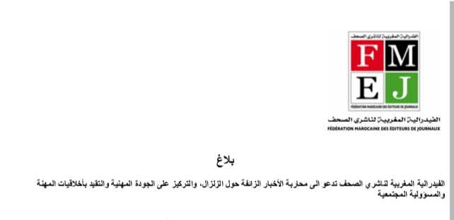 بلاغ..الفيدرالية المغربية لناشري الصحف تدعو إلى محاربة الأخبار الزائفة حول الزلزال، والتركيز على الجودة المهنية والتقيد بأخلاقيات المهنة والمسؤولية المجتمعية