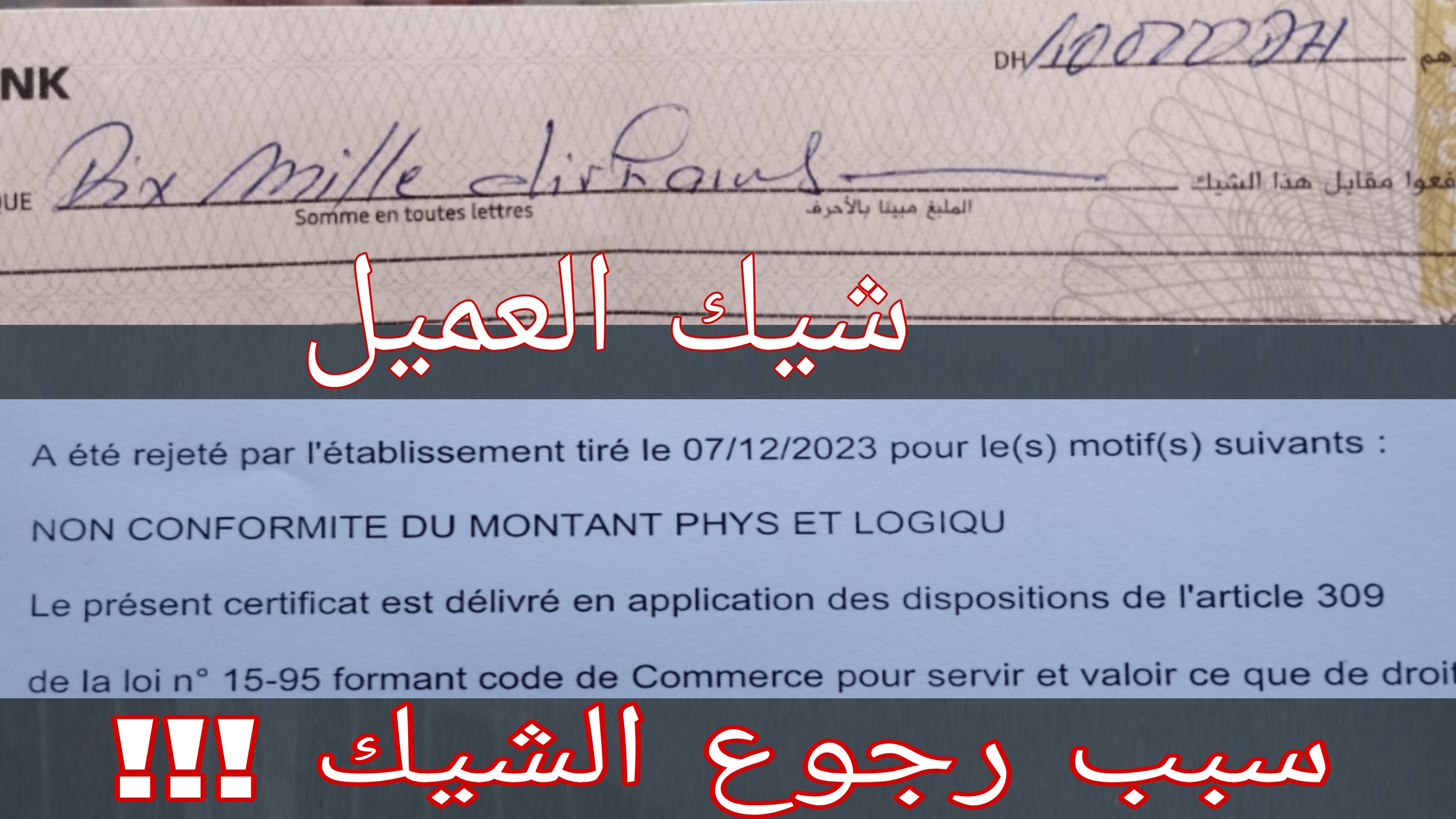 حسب الصورة ، كل شيء على ما يرام، لكن CIH رفض أداء الشيك لأحد عملاء بنك آخر بحجة عدم مطابقة الرقم المكتوب مع الحروف المكتوبة ، كان هذا هو سبب رجوع الشيك و خسارة صاحبه ل27 درهم مع ضياع الوقت و حتى التقة في الأبناك التي تتعامل بطريقة غير مفهومة حتى مع بعضها البعض .
